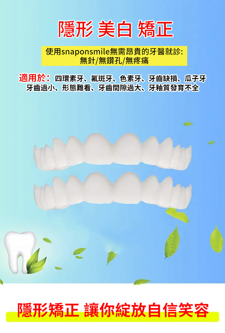 snaponsmile德國第三代牙套,軟硅膠烤瓷技術,隱形矯正美白牙齒,佩戴摘取自如,佩戴舒適,讓妳的笑容更加自信!【限時特賣】買一送一